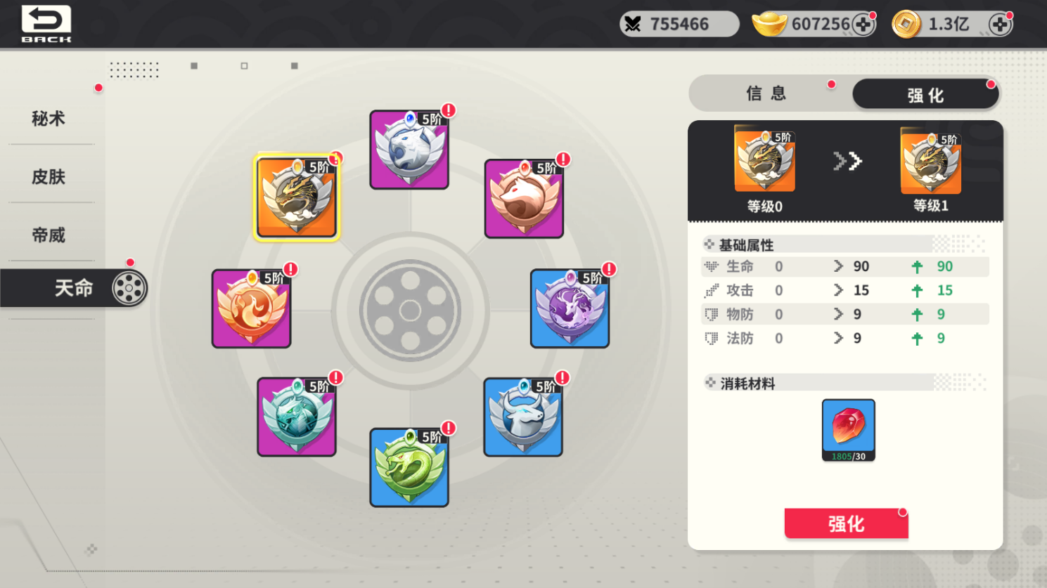 玩家可以通过打造材料获得对应天命,同时可以装备天命来提升数值。天命采用换代形式,不同等级装备的天命阶数是不一样的。同时天命可以进行强化和突破,提升天命属性。