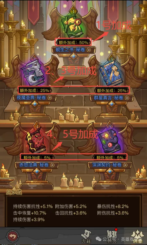 无论是否拼合成功,都可以进行供奉,供奉页面中存在最多5个圣座,根据供奉的圣座不同,可获得的额外加成有所不同,部分圣座需要达到对应等级解锁;圣座越位于下方,则对高级词条的额外加成越少,因此,可以选择将最强力的秘典或古籍放在1号