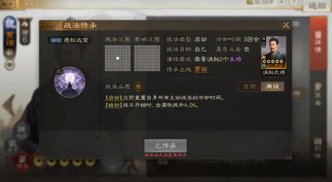【削弱】「贾诩」传承战法「通权达变」:战斗开始时,全属性提升由0.4%→4%调整为0.2%→2%