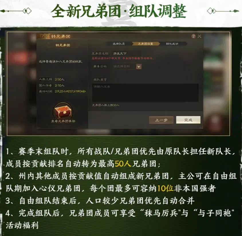 - 按照贡献排名自动组成50人的新【兄弟团】,自由组队期间可换团,每个团最多可容纳10位非本国强者