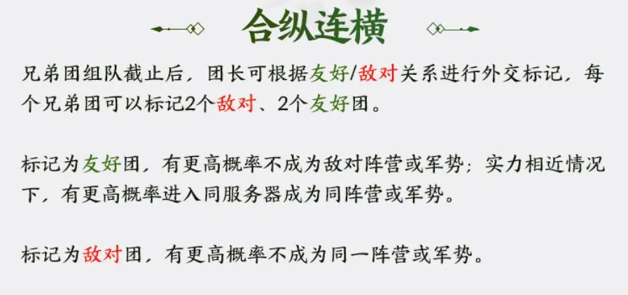 - 【兄弟团】组队结束后,团长可根据友好/敌对关系进行外交标记,每个兄弟团可以标记2个敌对、2个友好团。